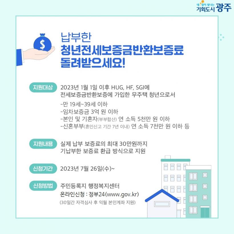 û³âÀÇ Áְźñ ºÎ´ãÀ» ¿ÏÈÇÏ°í ¾ÈÁ¤Àû ÁÖ°Åȯ°æ Á¶¼ºÀ» À§ÇØ ±¤Áֽð¡ ´ëÃâÀÌÀÚ¸¦ ¿¬ ÃÖ´ë 200¸¸¿ø±îÁö ÃÖÀå 4³â°£ Áö¿øÇÑ´Ù. Çѱ¹ÁÖÅñÝÀ¶°ø»ç°¡ º¸ÁõÇÏ°í ±¤ÁÖÀºÇàÀÌ ¿¬ 2.5% ±Ý¸®·Î ÃÖ´ë 1¾ï¿ø±îÁö ÁÖÅÃÀÓÂ÷º¸Áõ±Ý ´ëÃâÀ» ½ÇÇàÇÑ´Ù. ´ëÃâÀÌÀ² ¿¬ 2.5% °¡¿îµ¥ ±¤Áֽð¡ 2%¸¦ Áö¿øÇÏ°í ³ª¸ÓÁö 0.5%¸¸ ÀںδãÇÑ´Ù.