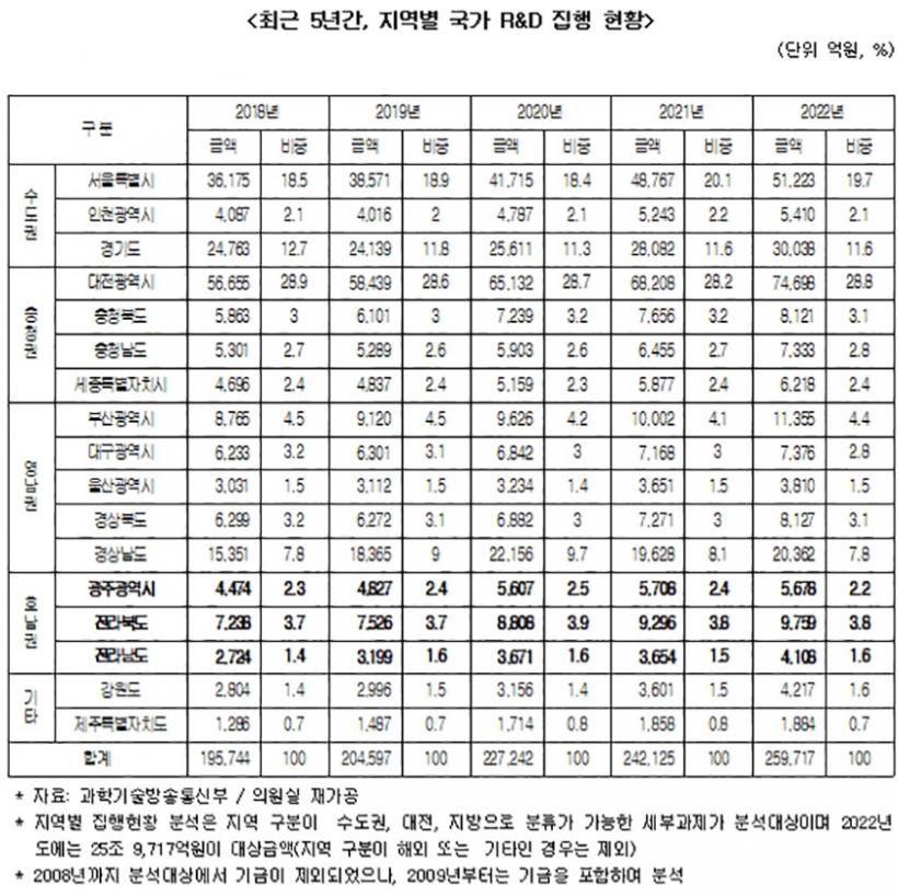 ±¹È¸ °úÇбâ¼úÁ¤º¸¹æ¼ÛÅë½ÅÀ§¿øÈ¸ ¹ÎÇü¹è ÀÇ¿ø(´õºÒ¾î¹ÎÁÖ´ç, ±¤ÁÖ ±¤»êÀ»)¿¡ µû¸£¸é, À۳⵵ ÁöÀÚüº° ÁýÇà ±¹°¡ R&D ¿¹»êÀº 25Á¶ 9,717¾ï¿øÀÌ´Ù. ÀÌ Áß °¡Àå ¸¹Àº ¿¹»êÀº ÃæÃ»±Ç¿¡ ÅõÀԵƴÙ,