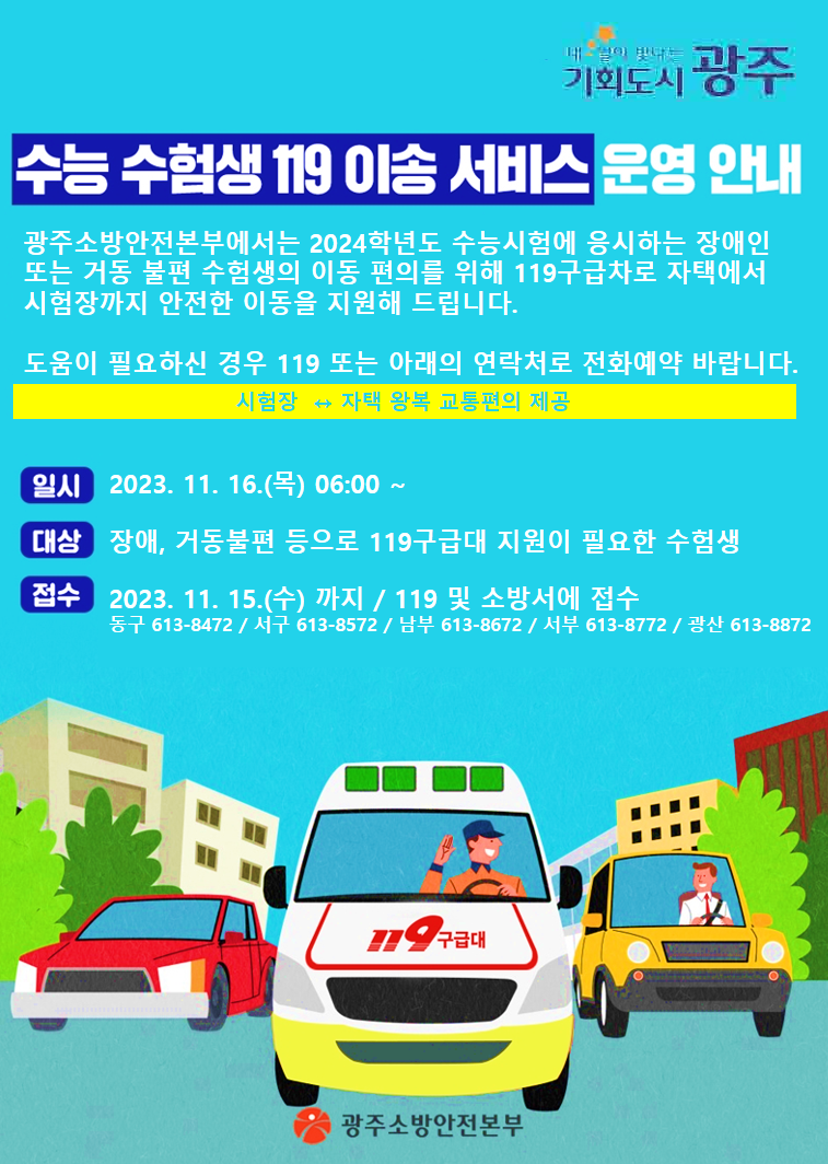 [°ø°£´º½º = ±è¼ö±Ù±âÀÚ] ±¤ÁÖ±¤¿ª½Ã¼Ò¹æ¾ÈÀüº»ºÎ´Â ¿À´Â 16ÀÏ ½Ç½ÃÇÏ´Â 2024Çг⵵ ´ëÇмöÇдɷ½ÃÇè ¼öÇè»ý ÆíÀǸ¦ Áö¿øÇϱâ À§ÇØ ¡®119ÀÌ¼Û ¼ºñ½º¡¯¸¦ Á¦°øÇÑ´Ù.
