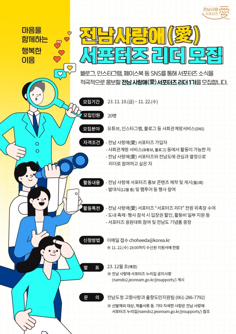 Àü³² »ç¶û¾Ö ¼Æ÷ÅÍÁî¿¡ °¡ÀÔÇÑ »ç¶÷ Áß Àü³²¿¡ ´ëÇÑ °ü½É°ú ¿Á¤À» °¡Áö°í È«º¸ ¹× ¸¶ÄÉÆÃ È°µ¿À» ÇÏ°í ½ÍÀº »ç¶÷Àº ´©±¸³ª ½ÅûÇÒ ¼ö ÀÖÀ¸¸ç, ´©¸®Áý(https://namdo2.jeonnam.go.kr/jnsupports/)À» ÅëÇØ Áö¿øÇÒ ¼ö ÀÖ´Ù.