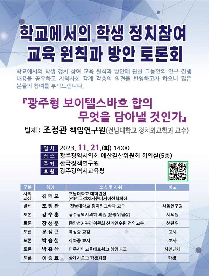 ±è´ö¸ð (Àü.Çѱ¹Á¤Ä¡Ä¿¹Â´ÏÄÉÀ̼ÇÇÐȸÀå) ¿øÀåÀÌ »çȸ¿Í ÁÂÀå ¿ªÇÒÀ» ¸ÃÀ¸¸ç Á¶Á¤°ü (Àü³²´ë ±³¼ö) Ã¥ÀÓ¿¬±¸¿øÀÌ ¹ßÁ¦¸¦ Ã¥ÀÓÁö°Ô µÈ´Ù. ÀÌÈÄ ¡ãÀ̽ÂÈ¿(»ì·¹½Ã¿À°í ÇлýȸÀå) Çлý ´ëÇ¥ ¡ã¹®¼º±Ù(±³ÃÑ)¡¤¹Ú½Âö(°¢ÈÁß ±³»ç) ±³¿ø ´ëÇ¥ ¡ã°¼öÈÆ(±¤ÁÖ±¤¿ª½ÃÀÇȸÀÇ¿ø)¡¤¹ÚÈ«»ê(¹ÎÁֽùα³À°³×Æ®¿öÅ© »óÀÓ´ëÇ¥) ½Ã¹Î´ëÇ¥ ¡ãÀå¼ºÈÆ(Áß¾Ó¼±°Å°ü¸®À§¿øÈ¸ ÀüÀÓ±³¼ö) À¯°ü±â°ü ´ëÇ¥ µî 6¸íÀÌ 3½Ã°£ µ¿¾È Åä·ÐÀ» ÁøÇàÇÒ ¿¹Á¤ÀÌ´Ù. Åä·Ðȸ´Â °ü½É ÀÖ´Â ±¤ÁÖ ½Ã¹ÎÀº ´©±¸³ª Âü¼®ÇÒ ¼ö ÀÖÀ¸¸ç Æ÷½ºÅÍÀÇ QRÄڵ带 ÅëÇØ ½ÅûÇÒ ¼ö ÀÖ´Ù.