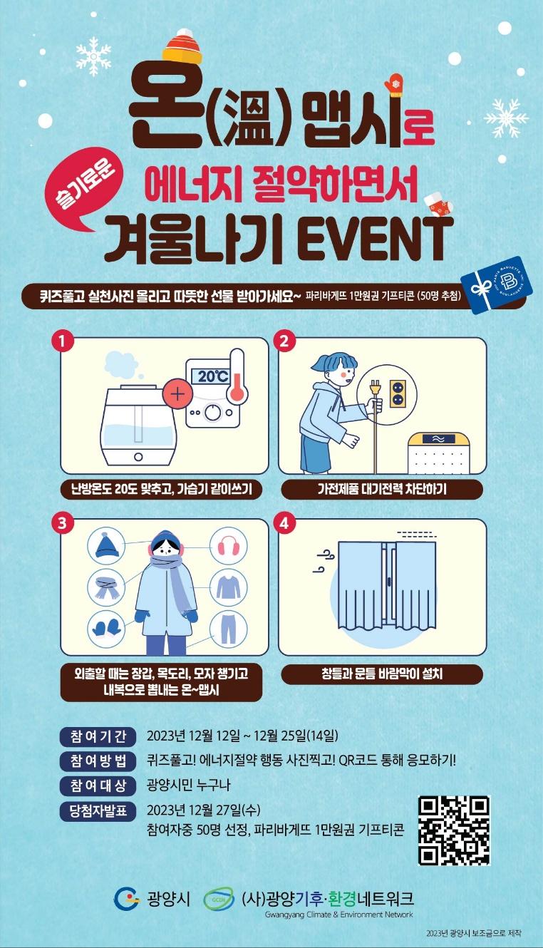 ¶ÇÇÑ, (»ç)Àü³²±¤¾ç±âÈÄ․ȯ°æ³×Æ®¿öÅ©´Â ¿Â¸Ê½Ã·Î °Ü¿ï³ª±â À̺¥Æ®¸¦ ÀÌ´Þ 12ÀϺÎÅÍ 25ÀϱîÁö ÁøÇàÇÑ´Ù. À̺¥Æ®´Â ±¤¾ç½Ã¹Î ´©±¸³ª ÄûÁ Ç®°í ¿¡³ÊÁö Àý¾à Çൿ »çÁøÀ» Âï¾î QRÄڵ带 ÅëÇØ ÀÀ¸ðÇÏ¸é µÇ°í, Ãß÷À» ÅëÇØ 1¸¸¿ø ±Ç ±âÇÁƼÄÜ ¼±¹°À» ÁõÁ¤ÇÑ´Ù.