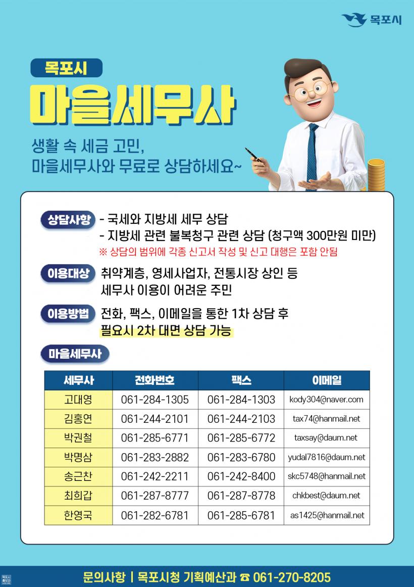 ¸ñÆ÷½Ã Á¦5±â ¸¶À»¼¼¹«»ç´Â 7¸íÀ¸·Î ¼¼¹« »ó´ãÀ» ¿øÇÏ´Â ½Ã¹ÎÀº ÇàÁ¤¾ÈÀüºÎ ¹× ½Ã ȨÆäÀÌÁö¿¡¼ °¡±îÀÌ ÀÖ´Â ¸¶À»¼¼¹«»ç¸¦ È®ÀÎÇØ »ó´ãÀ» ½ÅûÇÏ¸é µÈ´Ù. »ó´ãÀº ÀüȻӸ¸ ¾Æ´Ï¶ó ÆÑ½º, À̸ÞÀϷεµ ½ÅûÇÒ ¼ö ÀÖ°í Ãß°¡»ó´ãÀÌ ÇÊ¿äÇÏ¸é ´ë¸é»ó´ãµµ °¡´ÉÇÏ´Ù.