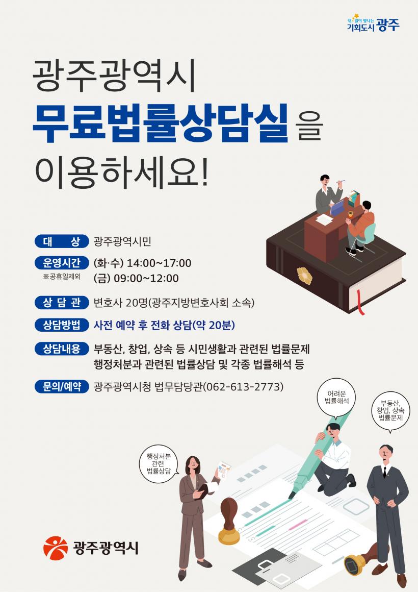 [°ø°£´º½º = ±è¼ö±Ù±âÀÚ] ±¤ÁÖ±¤¿ª½Ã(½ÃÀå °±âÁ¤)°¡ »ýȰ ¼Ó ¹ý·ü µµ¿òÀÌ ÇÊ¿äÇÑ ½Ã¹ÎµéÀ» À§ÇØ ¿î¿µÇÏ´Â ¹«·á¹ý·ü»ó´ã½ÇÀ» 2¿ùºÎÅÍ È®´ë ½ÃÇàÇÑ´Ù.