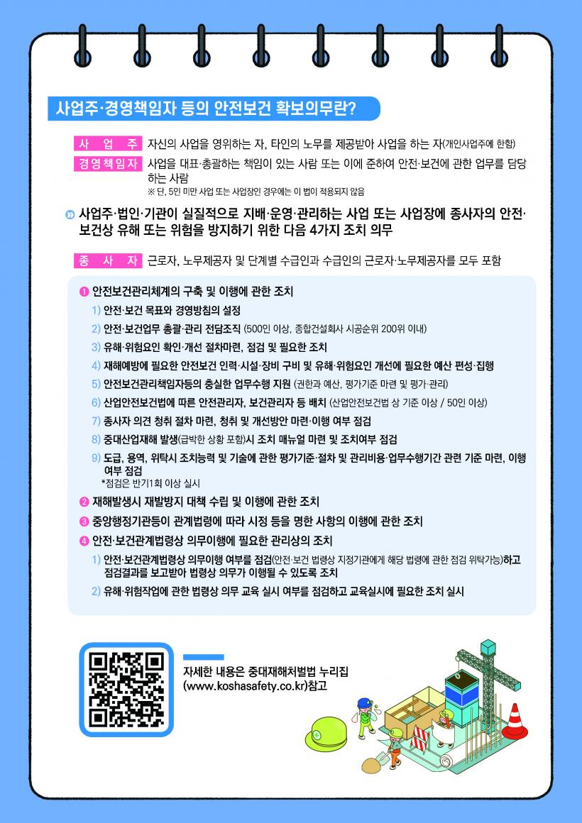 ÇÑÆí Áß´ëÀçÇØÃ³¹ú¹ýÀº Áß´ëÀçÇØ ¹ß»ý ¶§ ¹«Á¶°Ç »ç¾÷ÁÖ¿Í °æ¿µÃ¥ÀÓÀÚ µîÀÌ Ã³¹úµÇ´Â °ÍÀº ¾Æ´Ï¸ç »ê¾÷¾ÈÀüº¸°Ç¹ý µî °³º° ¹ý·É Áؼö»çÇ× ¹× ¾ÈÀüº¸°Ç°ü¸®Ã¼°è ±¸Ãà µî »ç¾÷ÁÖ¿Í °æ¿µÃ¥ÀÓÀÚ µîÀÇ ¾ÈÀü ¹× º¸°Ç È®º¸ Àǹ«¸¦ ÀÌÇàÇϸé ó¹úÀº ¸éÇÏ°Ô µÈ´Ù. Áß´ëÀçÇØÃ³¹ú¹ý¿¡ ´ëÇÑ ÀÚ¼¼ÇÑ ³»¿ëÀº Áß´ëÀçÇØÃ³¹ú¹ý ´©¸®Áý(www.koshasafety.co.kr)¿¡¼ È®ÀÎÇÒ ¼ö ÀÖ´Ù.