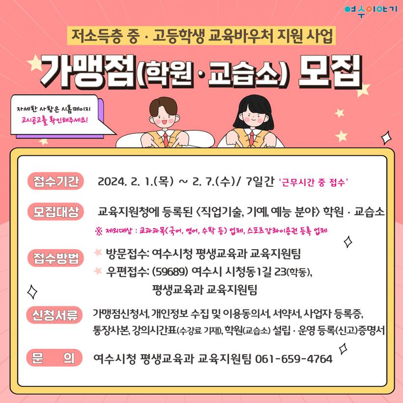 [°ø°£´º½º = ±è¿ëÁø±âÀÚ] ¿©¼ö½Ã(½ÃÀå Á¤±â¸í)°¡ ¿ÃÇØ ù ½ÃÇàÇÏ´Â ¡®Àú¼ÒµæÃþ Áß․°íµîÇлý ±³À°¹Ù¿ìó Áö¿ø »ç¾÷¡¯¿¡ Âü¿©ÇÒ °¡¸ÍÁ¡À» ¿À´Â 2¿ù 1ÀϺÎÅÍ 7ÀϱîÁö ¸ðÁýÇÑ´Ù.