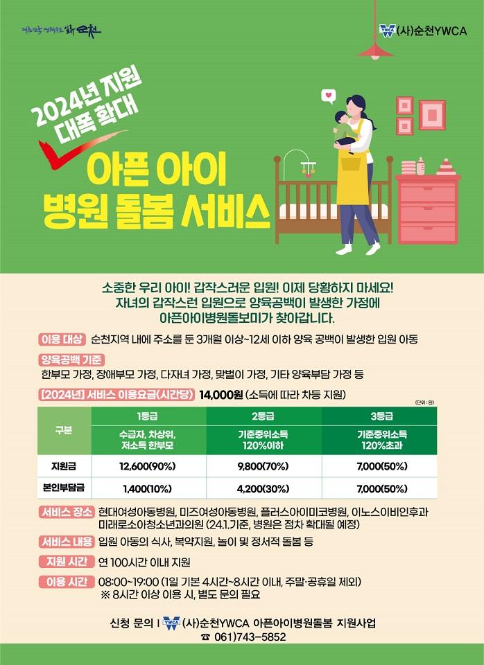 ¾ÆÇ¾ÆÀÌ º´¿øµ¹º½ ¼ºñ½º °ü·Ã ¹®ÀÇ´Â (»ç)¼øÃµYWCA(¢Ï061-743-5852)·Î ÇÏ¸é µÈ´Ù.