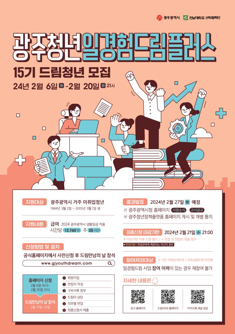 »ç¾÷¿¡ Âü¿©ÇÏ´Â ¡®µå¸²Ã»³â¡¯Àº ¸ÅĪµÈ »ç¾÷Àå¿¡¼ ÁÖ 25½Ã°£¾¿ 5°³¿ù°£ ÀϰæÇèÀ» ÇÏ°Ô µÇ¸ç, ±¤Áֽà »ýȰÀÓ±Ý ¼öÁØ(¼¼Àü ¿ù 167¿©¸¸¿ø)ÀÇ ±Þ¿©¸¦ ¹Þ´Â´Ù. ¶Ç °øÅë±³À°°ú À¯Çüº° Á÷¹«¿ª·® ±³À°À» ÅëÇØ Ãë¾÷¿ª·®À» °ÈÇϰí, Áö¿ª»çȸ Âü¿© µî û³â ¿¬°á¸Á(³×Æ®¿öÅ·) Ȱµ¿¿¡ Âü¿©ÇÑ´Ù.
