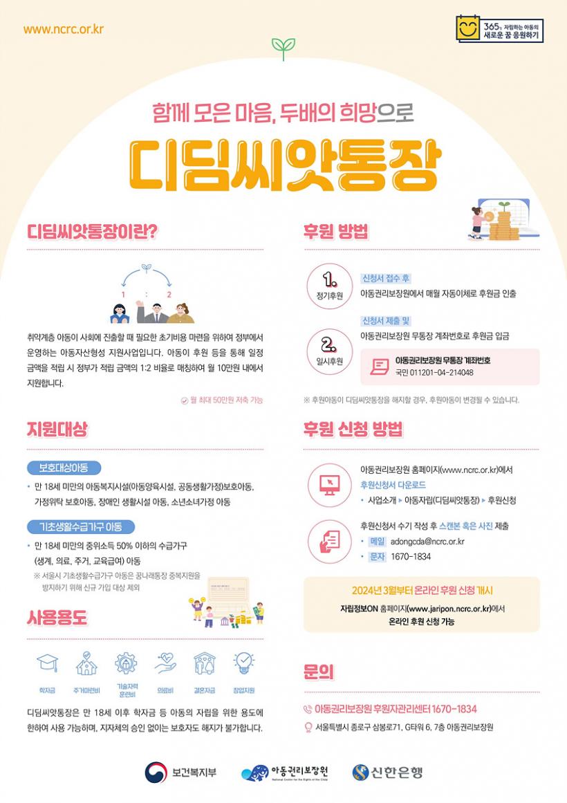 ¡®µðµõ¾¾¾ÑÅëÀ塯Àº ¸Å¿ù ÀÏÁ¤ ±Ý¾×À» ÀúÃàÇÏ¸é ±¹°¡(ÁöÀÚü)°¡ 1´ë 2 ¸ÅĪÀ¸·Î ¿ù ÃÖ´ë 10¸¸ ¿øÀ» Àû¸³ÇØ ÁÖ´Â »ç¾÷ÀÌ´Ù. ÀÚ±ÝÀº Àú¼ÒµæÃþ ¾Æµ¿ÀÌ »çȸ¿¡ ÁøÃ⠽à ÇÐÀÚ±Ý, Áְźñ, ±â¼úÀÚ°Ý ¹× Ãë¾÷ ÈÆ·Ã µîÀÇ ÀÚ¸³ ±â¹Ý±ÝÀ¸·Î »ç¿ëÇÒ ¼ö ÀÖ´Ù.