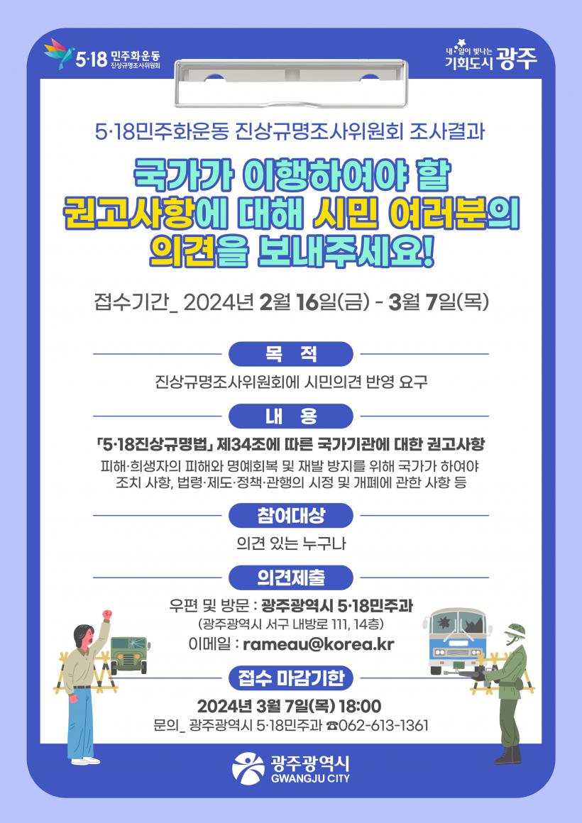 ½Ã¹Î ÀǰßÁ¢¼ö´Â 16ÀϺÎÅÍ 3¿ù 7ÀϱîÁö ÁøÇàµÇ¸ç, ±¹°¡¿¡ ´ëÇÑ ±Ç°í»çÇ× °ü·Ã ÀǰßÀÌ ÀÖ´Â ½Ã¹ÎÀº ½ÃûÀ» ¹æ¹®Çϰųª µî±â¿ìÆí(±¤ÁÖ±¤¿ª½Ã ¼±¸ ³»¹æ·Î 111, 5¡¤18¹ÎÁÖ°ú(Ä¡Æòµ¿)), À̸ÞÀÏ(rameau@korea.kr)·Î Á¦ÃâÇÏ¸é µÈ´Ù. ´Ù¸¸ ÀçÆÇ ¶Ç´Â ¼ö»ç ÁßÀÎ »ç°Ç, 5¡¤18¿ª»ç¿Ö°î ¹× ÆïÈÑ, ÇãÀ§¡¤ºñ¹æ, ÀÍ¸í¿¡ ÀÇÇÑ Á¦¾È µîÀº Á¦¿ÜµÈ´Ù.