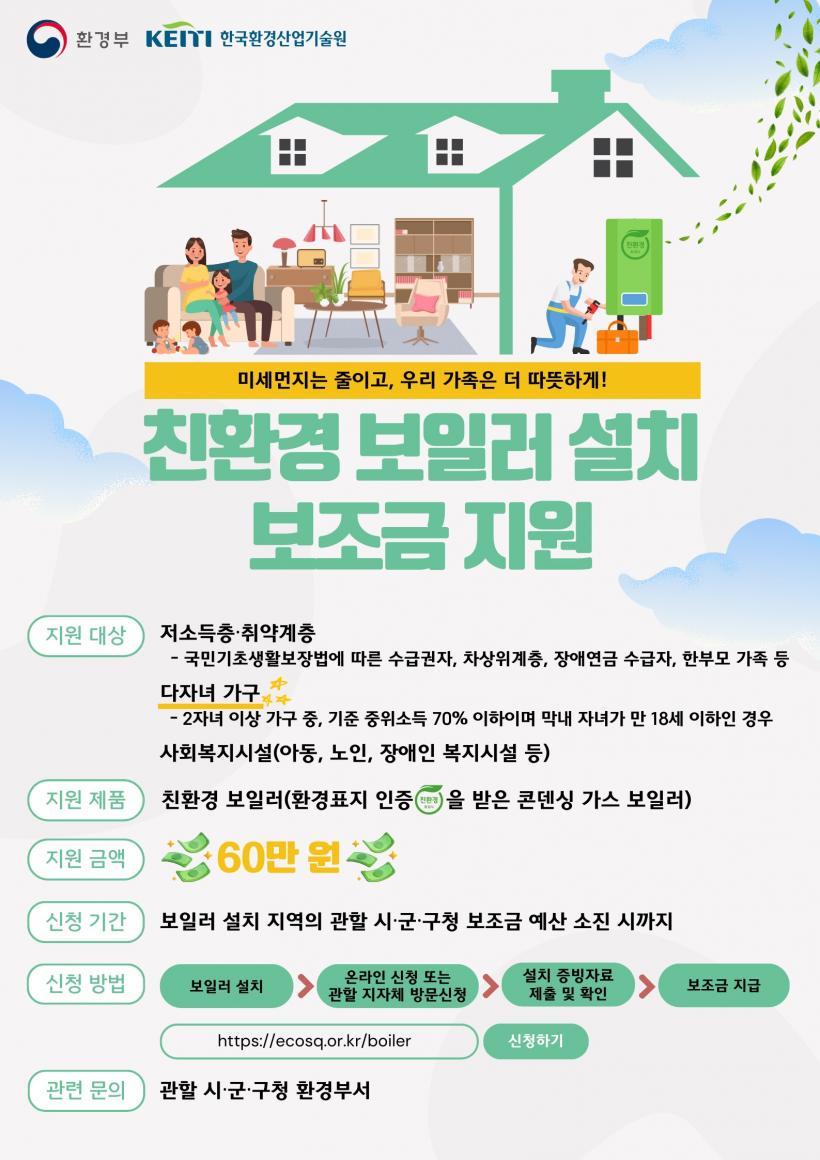 ÀÌ¿¡ µû¶ó µ¿±¸´Â ģȯ°æ º¸ÀÏ·¯ ¼³Ä¡¡¤±³Ã¼ Áö¿øÀ» ¿øÇÏ´Â Àú¼ÒµæÃþ°ú ´ÙÀÚ³à °¡±¸(ÁßÀ§¼Òµæ 70% ÀÌÇÏ) µîÀ» ´ë»óÀ¸·Î ¿¹»ê Çѵµ ³»¿¡¼ °¡±¸´ç 60¸¸ ¿øÀ» Áö¿øÇÒ °èȹÀÌ´Ù.