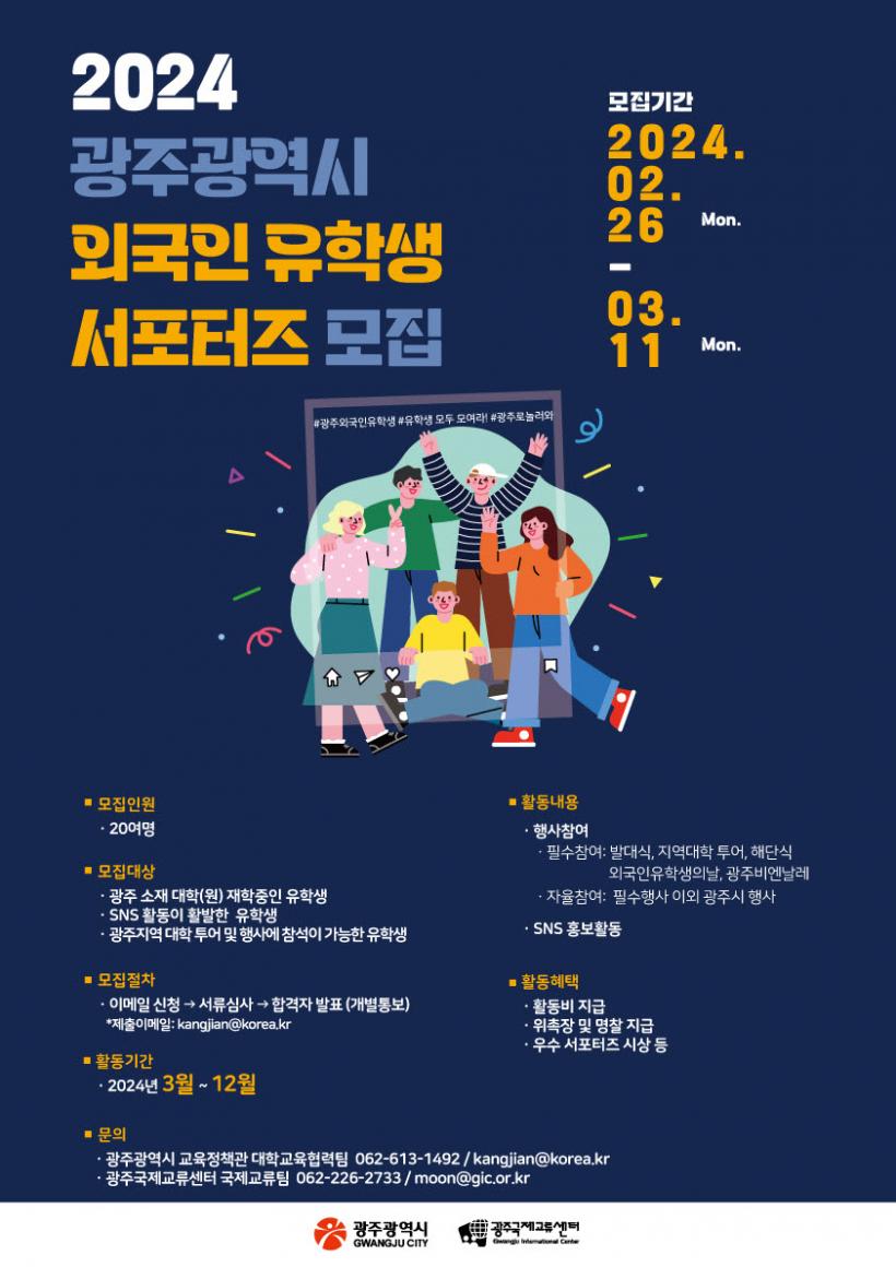 ¿Ü±¹ÀÎ À¯Çлý ¼Æ÷ÅÍÁî¿¡ ¼±Á¤µÇ¸é ±¤Áֽá¤Áö¿ª´ëÇÐ È«º¸Çà»ç¿¡ Âü¿©ÇÑ Èı⳪ ±¤ÁÖ¿¡¼ÀÇ À¯ÇлýȰ µîÀ» »çȸ°ü°è¸Á¼ºñ½º(SNS)¸¦ Ȱ¿ëÇØ È«º¸È°µ¿À» ÆîÄ¡°Ô µÈ´Ù. À̵鿡°Ô´Â ¸Å¿ù Ȱµ¿ºñ Áö±Þ, À§ÃËÀå ¼ö¿©, ¿ì¼ö ¼Æ÷ÅÍÁî ǥâ µî ÇýÅÃÀÌ ÁÖ¾îÁø´Ù.