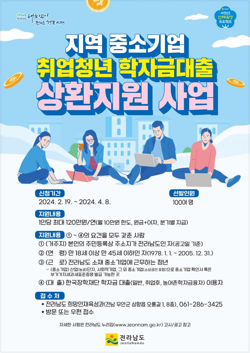 [°ø°£´º½º = ±è¼ö±Ù±âÀÚ] Àü¶ó³²µµ´Â Áß¼Ò±â¾÷¿¡ Ãë¾÷ÇÑ Ã»³âÀ» ´ë»óÀ¸·Î ÇÐÀÚ±Ý ´ëÃâ »óȯ Áö¿ø ´ë»óÀÚ¸¦ ¿À´Â 4¿ù 8ÀϱîÁö ¸ðÁýÇÑ´Ù°í ¹àÇû´Ù.
