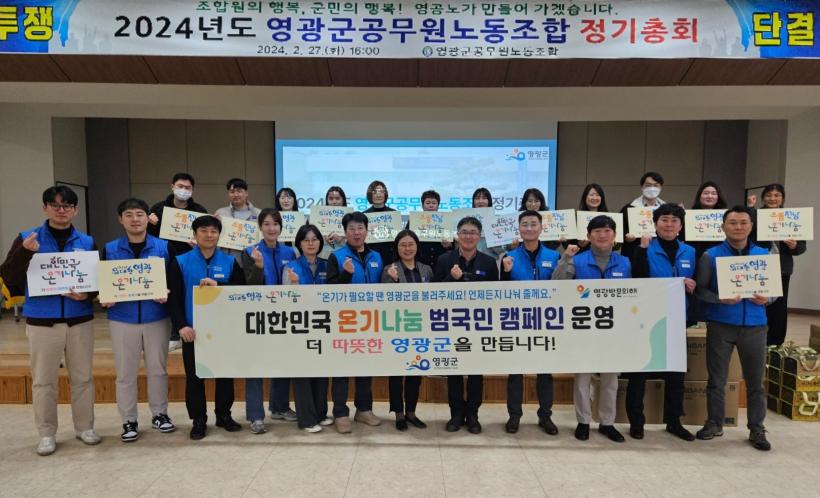 [°ø°£´º½º = ±è¼ö±Ù±âÀÚ ] ¿µ±¤±º°ø¹«¿ø³ëµ¿Á¶ÇÕ(À§¿øÀå Á¶¹ü±â)Àº Áö³ 27ÀÏ ¿µ±¤±ºÃ» 3Ãþ ´ëȸÀǽǿ¡¼ 300¿© ¸íÀÇ Á¶ÇÕ¿øÀÌ Âü¼®ÇÑ °¡¿îµ¥ 2024³âµµ Á¤±âÃÑȸ¸¦ ¿°í ¿µ±¤±º(±º¼ö °Á¾¸¸)¿¡¼ ÃßÁø ÁßÀÎ ¿Â±â³ª´® ¸±·¹ÀÌ Ä·ÆäÀο¡ µ¿ÂüÇÏ¿´´Ù.