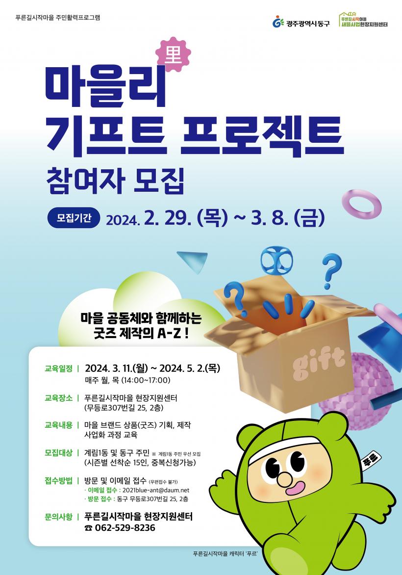 [°ø°£´º½º = ±è´ë¿µ±âÀÚ] ±¤ÁÖ µ¿±¸(±¸Ã»Àå ÀÓÅÃ)´Â °è¸²1µ¿ Ǫ¸¥±æ½ÃÀÛ¸¶À» »õ¶ã»ç¾÷ ÀÏȯÀ¸·Î ÁֹΠÁÖµµ ¸¶À» ºê·£µå ±¸ÃàÀ» À§ÇÑ ¡®¸¶À»¸®(×ì) ±âÇÁÆ® ÇÁ·ÎÁ§Æ®¡¯ Âü°¡ÀÚ 15¸íÀ» ¿À´Â 8ÀϱîÁö ¼±Âø¼ø ¸ðÁýÇÑ´Ù°í ¹àÇû´Ù.