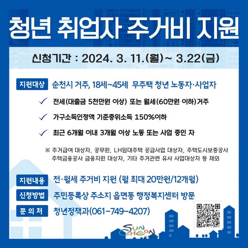 [°ø°£´º½º = ±è¿ëÁø±âÀÚ ] ¼øÃµ½Ã(½ÃÀå ³ë°ü±Ô)´Â û³â ±Ù·ÎÀÚ¿Í »ç¾÷ÀÚÀÇ ÁÖ°Å ¾ÈÁ¤À» µµ¸ðÇÏ°í °æÁ¦Àû ÀÚ¸³À» µ½±â À§ÇÑ 2024³â ¡®Ã»³â Ãë¾÷ÀÚ Áְźñ Áö¿ø»ç¾÷¡¯ ´ë»óÀÚ¸¦ ¸ðÁýÇÑ´Ù°í ¹àÇû´Ù.