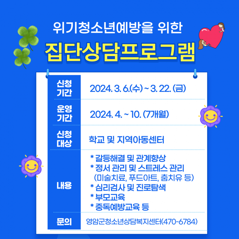 [°ø°£´º½º = ¾ÈÀ翵±âÀÚ ] ¿µ¾Ï±ºÃ»¼Ò³â»ó´ãº¹Áö¼¾ÅͰ¡ 4~10¿ù À§±â û¼Ò³â ¿¹¹æ Áý´Ü»ó´ãÇÁ·Î±×·¥À» ¿î¿µÇÑ´Ù.