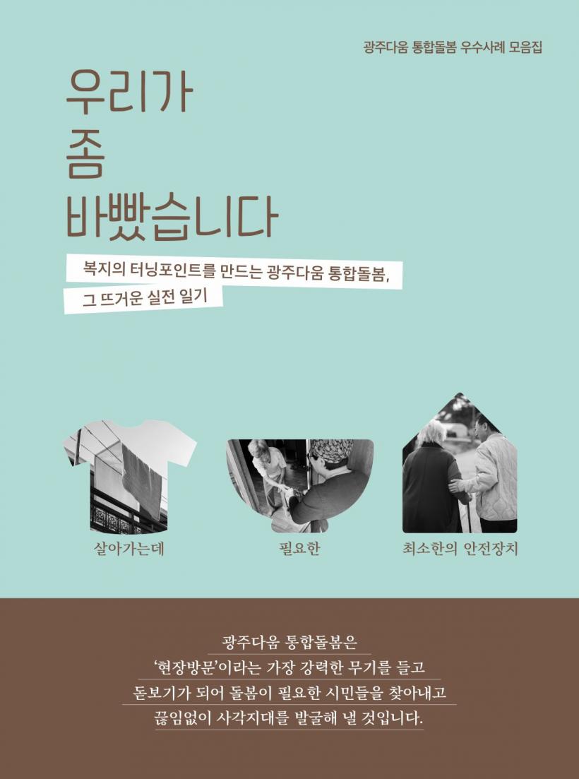 ±¤ÁÖ±¤¿ª½Ã(½ÃÀå °±âÁ¤)´Â Áö³ÇØ 4¿ù 1ÀÏ ½ÃÀÛÇÑ ±¤ÁÖ´Ù¿ò ÅëÇÕµ¹º½À» ÇöÀå¿¡¼ ½ÇÇàÇÑ µ¿ÇàÁ¤º¹Áö¼¾ÅÍ ´ã´ç °ø¹«¿øÀÇ ¿ì¼ö»ç·Ê ¸ðÀ½Áý ¡®¿ì¸®°¡ Á» ¹Ù»¦½À´Ï´Ù¡¯¸¦ ¹ß°£Çß´Ù.