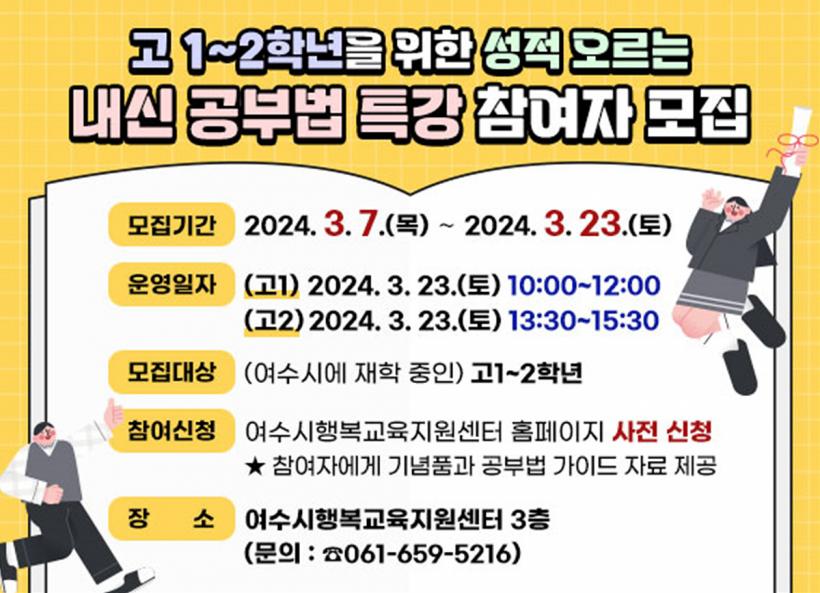 Âü¼®À» Èñ¸ÁÇÏ´Â ÇлýÀº ¿©¼ö½ÃÇູ±³À°Áö¿ø¼¾ÅÍ È¨ÆäÀÌÁö (www.yeosu.go.kr/edu)¿¡¼ »çÀü ½Åû ÈÄ Âü¼®ÇÒ ¼ö ÀÖÀ¸¸ç, ¸ðµç Âü¼®ÀÚ´Â ÄÚ³Ú ³ëÆ®¿Í °øºÎ¹ý °¡À̵å ÀÚ·áµµ Á¦°ø¹Þ´Â´Ù.