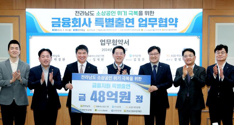 [°ø°£´º½º = ±è¼ö±Ù±âÀÚ] Àü¶ó³²µµ´Â ¼Ò»ó°øÀÎ ±ÝÀ¶Áö¿øÀ» ÅëÇÑ °æ¿µÀ§±â ±Øº¹À» À§ÇØ 18ÀÏ µµÃ»¿¡¼ Àü³²½Å¿ëº¸ÁõÀç´Ü, ³óÇù¡¤¿ì¸®¡¤±¹¹Î¡¤Çϳª¡¤½ÅÇÑ¡¤Ä«Ä«¿À¹ðÅ© 6°³ ±ÝÀ¶È¸»ç¿Í 48¾ï ¿ø Ưº°Ã⿬ Çù¾àÀ» Çß´Ù. À̷νá ÃÑ Ã⿬±ÝÀº 63¾ïÀ¸·Î ´Ã¾ú´Ù.