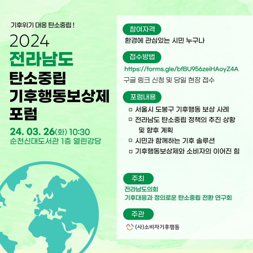 [°ø°£´º½º = ±è¼ö±Ù±âÀÚ] Àü³²µµÀÇȸ ¡®±âÈÄ´ëÀÀ°ú Á¤ÀǷοî ź¼ÒÁ߸³ Àüȯ ¿¬±¸È¸(´ëÇ¥À§¿ø ÁÖÁ¾¼·)¡¯°¡ ÁÖÃÖÇϰí (»ç)¼ÒºñÀÚ±âÈÄÇൿÀÌ ÁÖ°üÇÏ´Â 2024 Àü¶ó³²µµ ź¼ÒÁ߸³ ±âÈÄÇൿº¸»óÁ¦ Æ÷·³ÀÌ ¿À´Â 3¿ù 26ÀÏ ¼øÃµ ½Å´ëµµ¼°ü ¿¸°°´ç¿¡¼ °³ÃֵȴÙ.