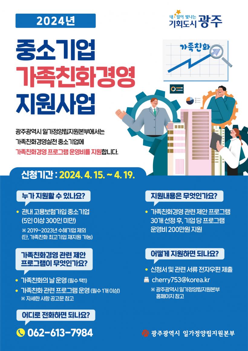 [°ø°£´º½º = ±è¼ö±Ù±âÀÚ] ±¤ÁÖ±¤¿ª½ÃÀϰ¡Á¤¾ç¸³Áö¿øº»ºÎ´Â Áß¼Ò±â¾÷ÀÌ °¡Á·Ä£È°æ¿µÀ» µµÀÔÇÒ ¼ö ÀÖµµ·Ï ¡®2024³â Áß¼Ò±â¾÷ °¡Á·Ä£È°æ¿µ Áö¿ø »ç¾÷¡¯¿¡ Âü¿©ÇÒ ±â¾÷À» °ø¸ðÇÑ´Ù.