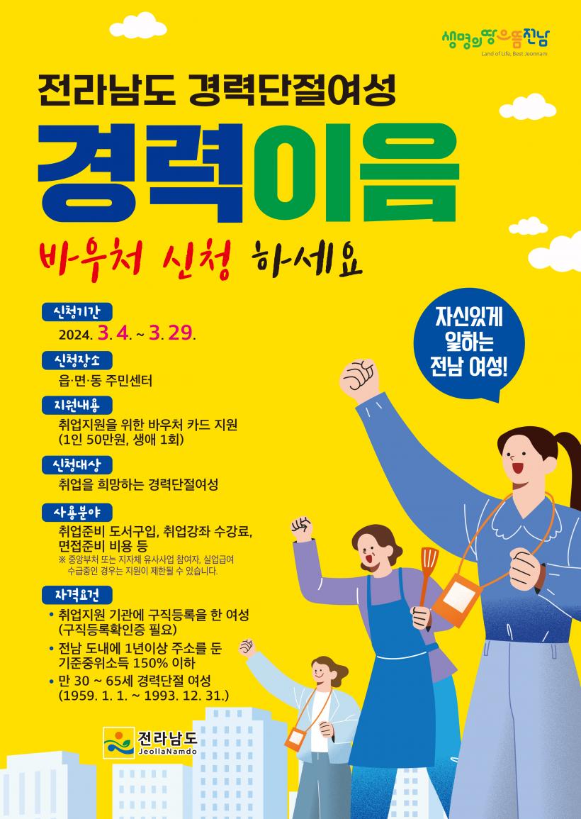 [°ø°£´º½º = ±è¼ö±Ù±âÀÚ] Àü¶ó³²µµ´Â Ãâ»ê°ú À°¾Æ µîÀ¸·Î Á÷ÀåÀ» ±×¸¸µÐ ÈÄ ÀçÃë¾÷¿¡ ¾î·Á¿òÀ» °Þ´Â °æ·Â ´ÜÀý ¿©¼º¿¡°Ô ±¸Á÷¿¡ ÇÊ¿äÇÑ Ãë¾÷¡¤¸éÁ¢ Áغñ ºñ¿ëÀ» Áö¿øÇÏ´Â ¡®°æ·ÂÀÌÀ½¹Ù¿ìó¡¯ ÀÌ¿ëÀÚ¸¦ ¿À´Â 29ÀϱîÁö ¸ðÁýÇÑ´Ù°í ¹àÇû´Ù.