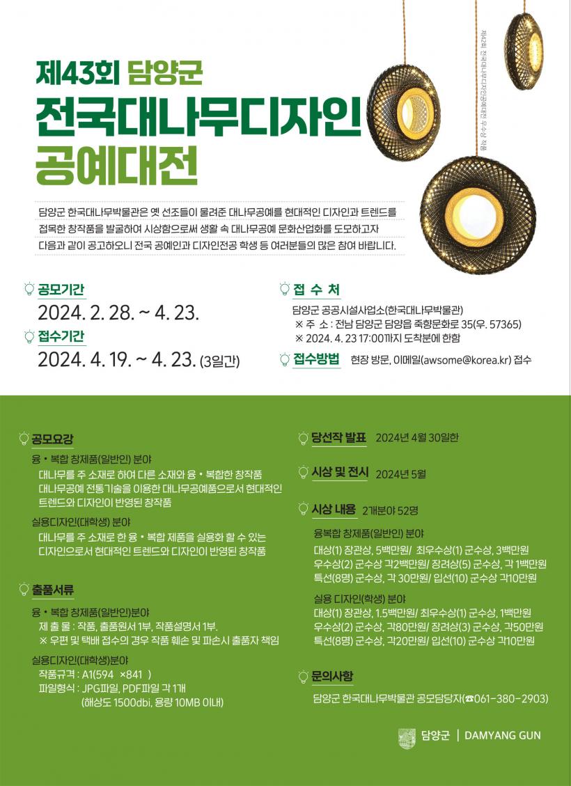 ¿¾ ¼±Á¶ºÎÅÍ À̾î¿Â ´ë³ª¹«°ø¿¹¿¡ Çö´ëÀûÀÎ µðÀÚÀΰú »ç¿ë¼ºÀ» Á¢¸ñÇÑ Ã¢ÀÛǰÀ» ¹ß±¼Çϱâ À§ÇØ °³ÃÖÇÏ´Â Àü±¹ ´ë³ª¹«µðÀÚÀΰø¿¹´ëÀüÀº ´ë³ª¹« À¶¡¤º¹ÇÕÁ¦Ç°°ú ½Ç¿ëµðÀÚÀÎ 2°³ ºÐ¾ß·Î °ü±¤±â³äǰ, »ýȰ¼Òǰ, »ç¹«¿ëǰ µîÀ» Ãâǰ ´ë»óÀ¸·Î ÇÑ´Ù.