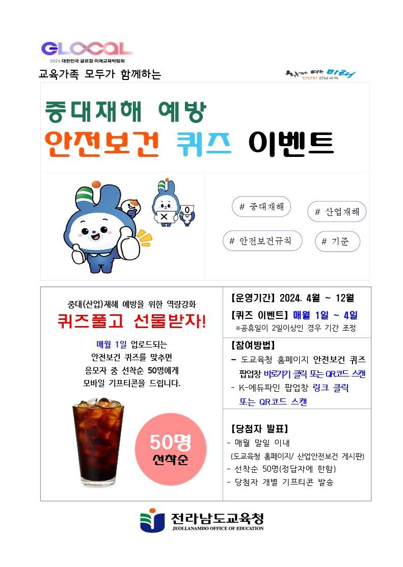 À̺¥Æ®´Â 4¿ùºÎÅÍ 12¿ù±îÁö ¿î¿µÇϸç, ¸Å¿ù 1 ~ 4ÀÏ »çÀÌ ÀÀ¸ðÇÒ ¼ö ÀÖ´Ù. ÄûÁî ³»¿ëÀº Áß´ëÀçÇØÃ³¹ú¹ý ÁÖ¿ä ³»¿ë°ú Àü³²±³À°Ã» Àǹ«ÀÌÇà »çÇ× µî Áß´ë(»ê¾÷)ÀçÇØ ¿¹¹æÀ» À§ÇÑ »çÇ×µéÀÌ´Ù.