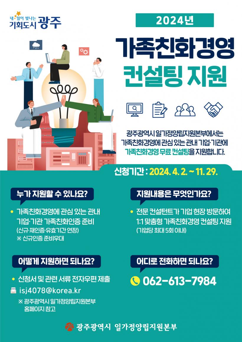 [°ø°£´º½º = ±è¼ö±Ù±âÀÚ] ±¤ÁÖ±¤¿ª½ÃÀϰ¡Á¤¾ç¸³Áö¿øº»ºÎ´Â Àϰú °¡Á¤, »îÀ» Á¶È·Ó°Ô º´ÇàÇÏ´Â ±â¾÷¹®È¸¦ Á¶¼ºÇϱâ À§ÇØ ¡®°¡Á·Ä£È°æ¿µ ÄÁ¼³ÆÃ¡¯¿¡ Âü¿©ÇÒ ±â¾÷¡¤±â°ü 10°÷À» 2ÀϺÎÅÍ ¼±Âø¼ø ¸ðÁýÇÑ´Ù.