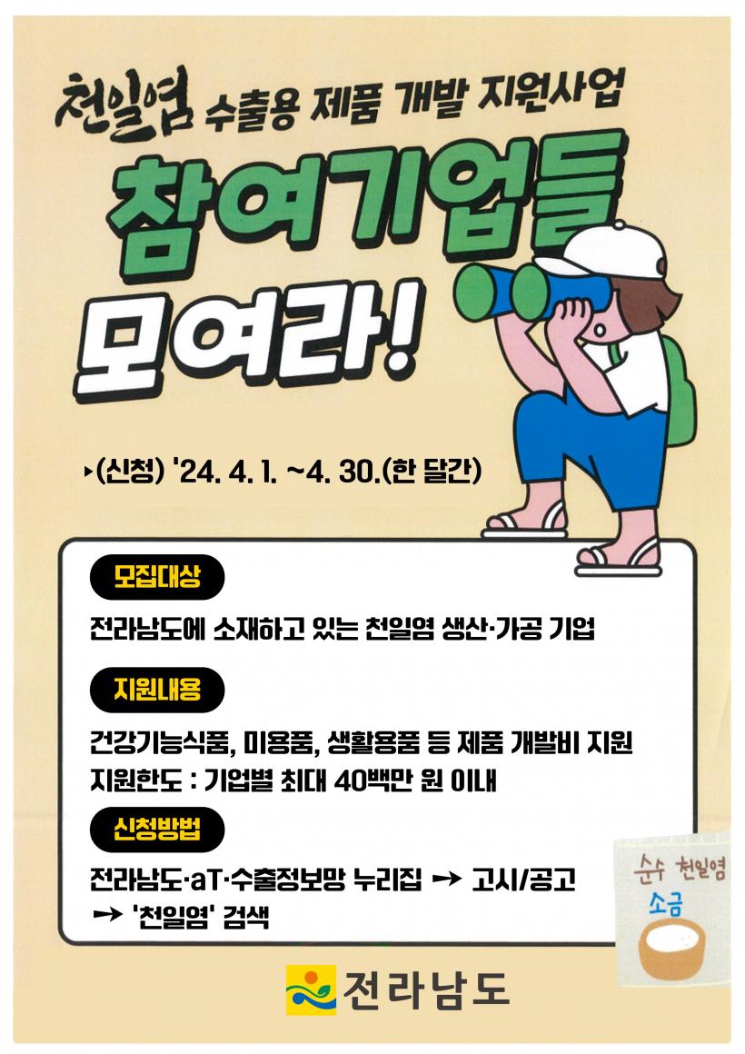 [°ø°£´º½º = ±è¼ö±Ù±âÀÚ] Àü¶ó³²µµ´Â õÀÏ¿° »ý»ê¡¤°¡°øÀÇ °íºÎ°¡°¡Ä¡ âÃâ°ú ¼öÃâ Ȱ¼ºÈ Áö¿øÀ» À§ÇØ ÃµÀÏ¿° ¼öÃâ¿ë Á¦Ç° °³¹ß Áö¿ø»ç¾÷ »ç¾÷ÀÚ ¸ðÁý¿¡ ³ª¼±´Ù.
