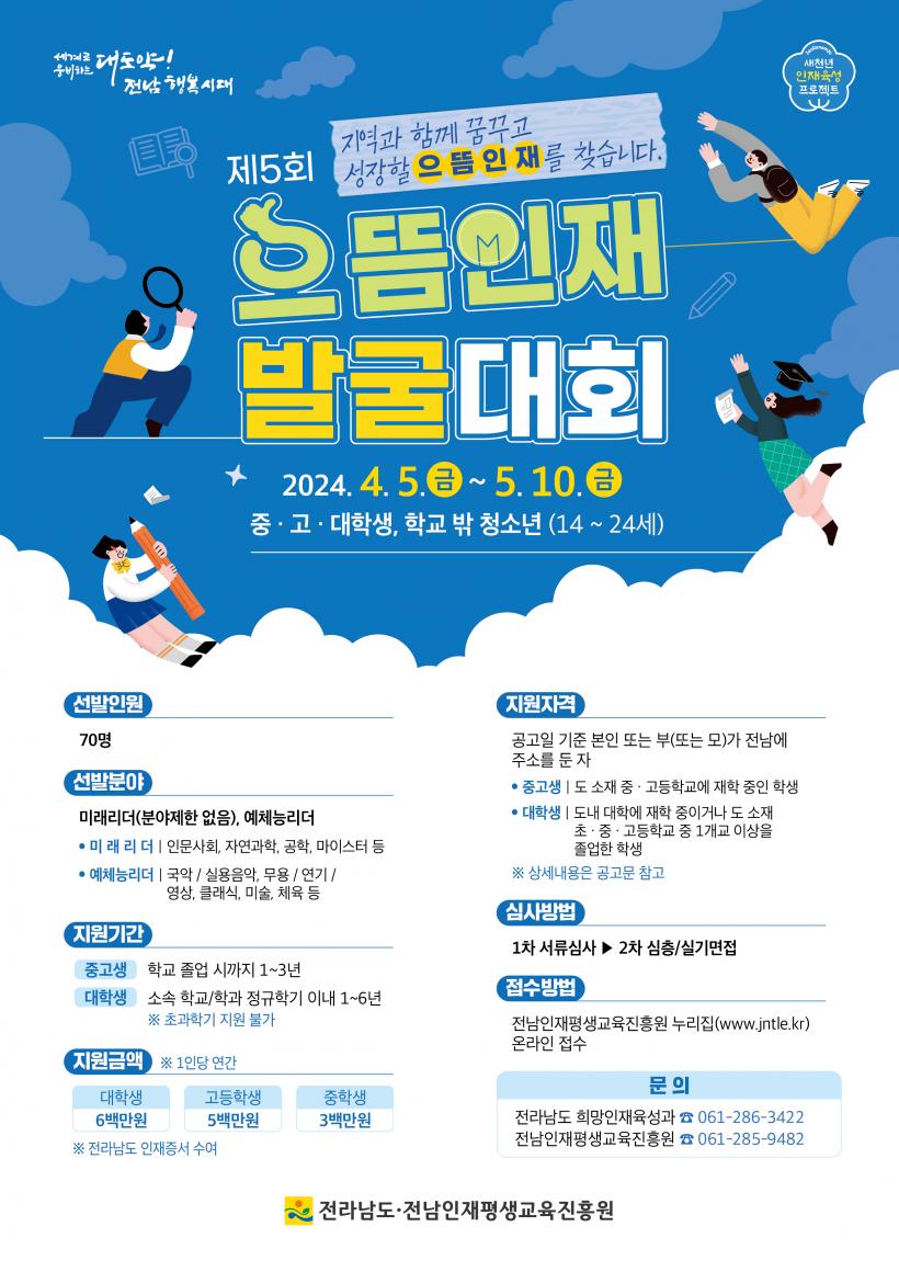 À¸¶äÀÎÀç ¹ß±¼´ëȸ´Â Àü³²ÀÇ ÁÖ¿ªÀ¸·Î ¼ºÀåÇÒ ÀÎÀ縦 ¹ß±¼Çϰí À°¼ºÇϱâ À§ÇÑ ¡®»õõ³â ÀÎÀçÀ°¼º ÇÁ·ÎÁ§Æ®¡¯ ÀÏȯÀ¸·Î 2019³âºÎÅÍ ½ÃÀÛÇØ 5³â µ¿¾È 411¸íÀ» ¼±¹ßÇß´Ù. ±¹°¡´ëÇ¥ ¼±¹ßÀ» ºñ·ÔÇØ Àü±¹´ëȸ ÀÔ»ó, ³í¹® ¹ßÇ¥, ¼Àû Ãâ°£, ƯÇã Ãâ¿ø, Èñ¸Á ´ëÇÐ ÁøÇÐ µîÀÇ ¼º°ú¸¦ ³»°í ÀÖ´Ù.