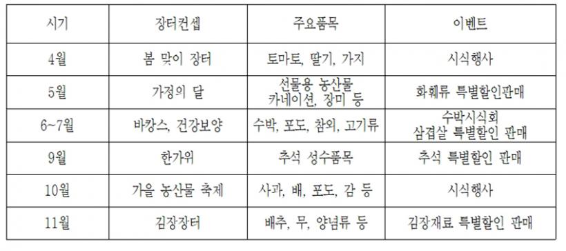 ±Ý¿äÁ÷°Å·¡ÀåÅÍ¿¡¼´Â ½Ã±â¿¡ µû¶ó ÇÒÀÎǰ¸ñÀ» ´Þ¸®ÇÑ´Ù. 5¿ù¿¡´Â °¡Á¤ÀÇ ´ÞÀ» ¸Â¾Æ Ä«³×ÀÌ¼Ç µî ÈÈÑ·ù¸¦, 6~7¿ù ÈÞ°¡Ã¶¿¡´Â ¼ö¹Ú¡¤»ï°ã»ìÀ», 9~10¿ù¿¡´Â »ç°ú¡¤¹è Ãß¼® Á¦¼ö¿ëǰÀ», 11¿ù¿¡´Â ±èÀåöÀ» ¾ÕµÎ°í ¹èÃß¡¤¹« µîÀ» ÇÒÀÎ ÆÇ¸ÅÇÒ ¿¹Á¤ÀÌ´Ù.