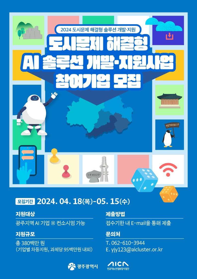 ¿ÃÇØ ¡®µµ½Ã¹®Á¦ ÇØ°áÇü AI ¼Ö·ç¼Ç Áö¿ø»ç¾÷¡¯¿¡ Âü¿©¸¦ Èñ¸ÁÇÏ´Â ±¤ÁÖÁö¿ª ÀΰøÁö´É±â¾÷Àº ¿À´Â 5¿ù 15ÀϱîÁö ÀΰøÁö´É»ê¾÷À¶ÇÕ»ç¾÷´Ü ´©¸®Áý(http://aica-gj.kr)À» ÅëÇØ Áö¿øÇÏ¸é µÈ´Ù.