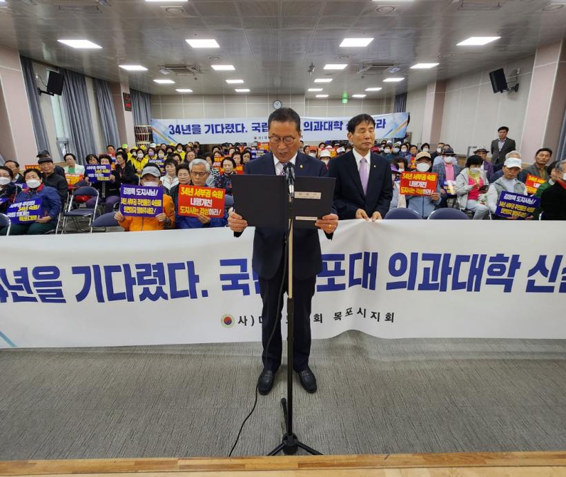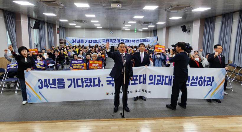 À̳¯ ´ëÇѳëÀÎȸ ¸ñÆ÷½ÃÁöȸ ÀÓÁ÷¿ø°ú ȸ¿ø 200¿© ¸íÀÌ ÇÑÀÚ¸®¿¡ ¸ð¿© ¡°¼ºÎ±Ç Áö¿ª¹ÎÀÇ ÀÇ·á ¼ºñ½º Àý¹ÚÇÔÀ» Ç¥¸íÇÏ¸ç °í·ÉȰ¡ ½É°¢ÇÑ Àü³² ¼ºÎ±Ç ±¹¸³¸ñÆ÷´ëÇб³¿¡ Àǰú´ëÇÐÀ» ½Å¼³ÇÏ¶ó¡±°í ¿ÜÄ¡¸é¼ Ÿ´ç¼ºÀÌ ÃæºÐÈ÷ ÀÔÁõµÈ ±¹¸³¸ñÆ÷´ëÇб³¿¡ Àǰú´ëÇÐÀ» ¼³¸³ÇÒ °ÍÀ» °Á¶Çß´Ù.