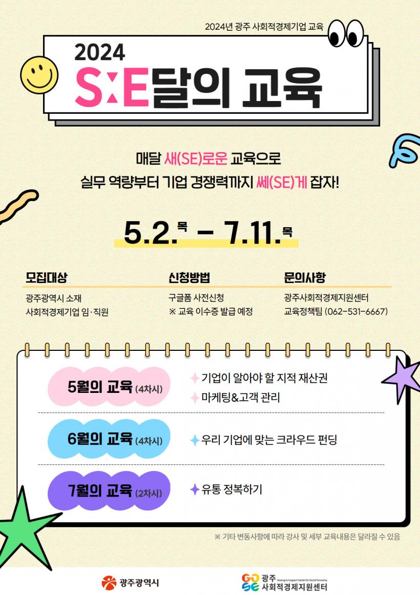 ÀÚ¼¼ÇÑ »çÇ×Àº ±¤ÁÖ»çȸÀû°æÁ¦Áö¿ø¼¾ÅÍ ±³À°Á¤Ã¥ÆÀ(062-531-6667~8)À¸·Î ¹®ÀÇÇÏ¸é µÈ´Ù. ±âŸ Áö¿ø»ç¾÷, Çà»ç ¹× ±³À°¼Ò½ÄÀº īī¿ÀÅå ä³Î ¡®±¤ÁÖ»çȸÀû°æÁ¦Áö¿ø¼¾ÅÍ¡¯(https://pf.kakao.com/_KuWxkxl)À» ÅëÇØ ¾È³»¹ÞÀ» ¼ö ÀÖ´Ù.