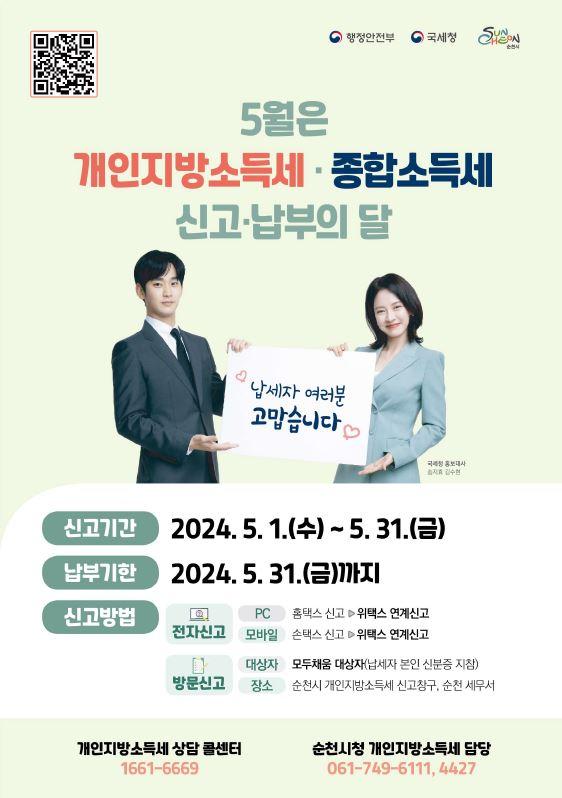 [°ø°£´º½º = ±è¿ëÁø±âÀÚ] ¼øÃµ½Ã(½ÃÀå ³ë°ü±Ô)´Â 2023³â ±Í¼Ó Á¾Çռҵ濡 ´ëÇÑ °³ÀÎÁö¹æ¼Òµæ¼¼¿Í Á¾Çռҵ漼¸¦ 5¿ù 1ÀϺÎÅÍ 5¿ù 31ÀϱîÁö ½Å°í‧³³ºÎÇØ¾ß ÇÑ´Ù°í ¹àÇû´Ù.