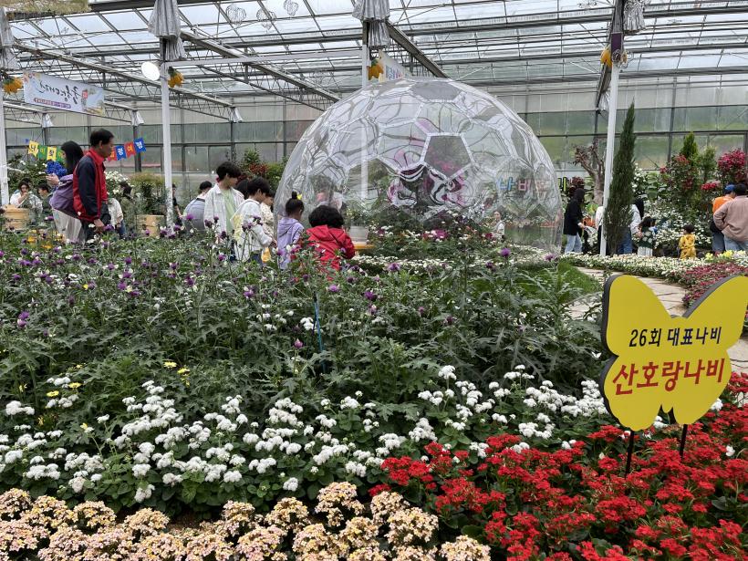 À̰÷ÀÇ ³ªºñ´Â ÇÔÆò±º³ó¾÷±â¼ú¼¾ÅÍ »çÀ° ¿Â½Ç¿¡¼ ÃàÁ¦ ÀÏÁ¤¿¡ ¸ÂÃç Àü³âµµºÎÅÍ »çÀ°µÈ ³ªºñ·Î, ź»ý °úÁ¤, ´©¿¡ ¹× ÇÑ »ìÀÌ µî 12Á¾ÀÇ °ïÃæ»ýŸ¦ ´Ùä·Ó°Ô ¿¬ÃâÇØ °ü¶÷°´µé¿¡°Ô »ö´Ù¸¥ º¼°Å¸®¸¦ ¼±»çÇÑ´Ù.