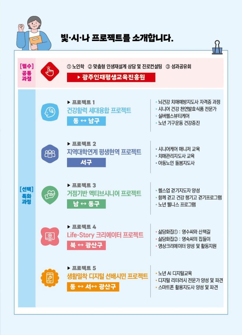 <³» ÀÏ(My job, Tomorrow)ÀÌ ºû(ÎðíÀ»)¡¤½Ã(½Ã´Ï¾î)¡¤³ª(³ª´®)> »ç¾÷Àº ±¤ÁÖ½Ã¿Í ÁøÈï¿ø, 5°³ ÀÚÄ¡±¸ÀÇ Çù·Â »ç¾÷ÀÌ´Ù. °í·ÉÃþÀ» ´ë»óÀ¸·Î Æò»ýÇнÀÀ» ÅëÇÑ »çȸÂü¿©¿Í °æÁ¦È°µ¿À» µ¶·ÁÇϰí, ¼¼´ë °£ ±³·ù°¡ Ȱ¹ßÈ÷ ÀÌ·ç¾îÁöµµ·Ï ¼³°èÇß´Ù.
