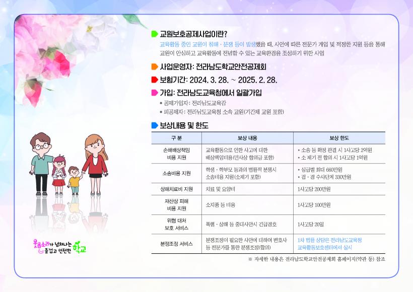 ¶ÇÇÑ ÆøÇà‧»óÇØ µî Áß´ë»ç¾È ½Ã ±ä±Þ°æÈ£¸¦ À§ÇÑ À§Çù´ëóº¸È£¼ºñ½º¸¦ ÃÖ´ë 20ÀÏ Áö¿øÇÑ´Ù. ±³¿øº¸È£°øÁ¦ »ç¾÷ °¡ÀÔ ´ë»óÀº Àü¶ó³²µµ±³À°Ã» ¼Ò¼Ó ±³¿ø(±â°£Á¦ ±³¿ø Æ÷ÇÔ)ÀÌ´Ù.