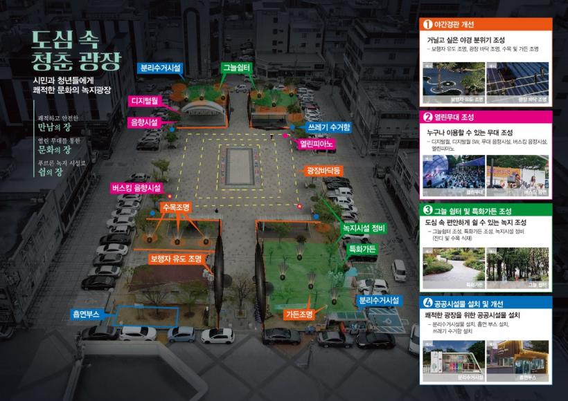 Á߸¶ 23È£ ±¤Àå¿¡ ¡®µµ½É ¼Ó ûÃᱤÀ塯À» Á¶¼ºÇØ Ã»³âµéÀÇ ¸¸³²ÀÇ Àå¼Ò·Î ÀÚ¸®¸Å±èÇÏ°í ½Ã¹Îµé¿¡°Ô ÀÏ»óÀÇ ÈÞ½ÄÀ» ÁÙ ¼ö ÀÖ´Â °ø°£À¸·Î Àçź»ý½ÃÄÑ Ä§Ã¼µÈ ÁÖº¯ »ó°¡ Ȱ¼ºÈ¿¡µµ ±â¿©ÇÒ °ÍÀ¸·Î ±â´ëÇϰí ÀÖ´Ù.