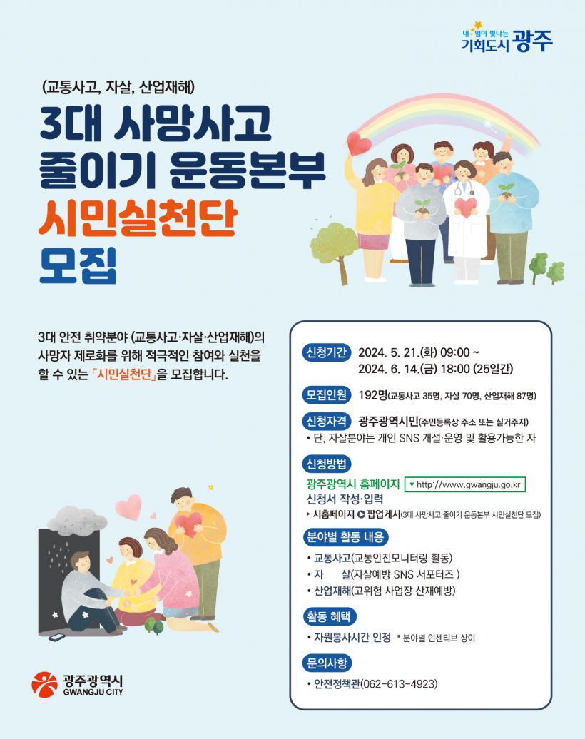 [°ø°£´º½º = ±è¼ö±Ù±âÀÚ] ±¤ÁÖ±¤¿ª½Ã(½ÃÀå °±âÁ¤)´Â ±³Åë»ç°í‧ÀÚ»ì‧»ê¾÷ÀçÇØ µî 3´ë ¾ÈÀü Ãë¾àºÐ¾ß »ç¸ÁÀÚ Á¦·Îȸ¦ À§ÇÑ ½Ã¹Î½Çõ´ÜÀ» 21ÀϺÎÅÍ 6¿ù14ÀϱîÁö °ø°³¸ðÁýÇÑ´Ù.