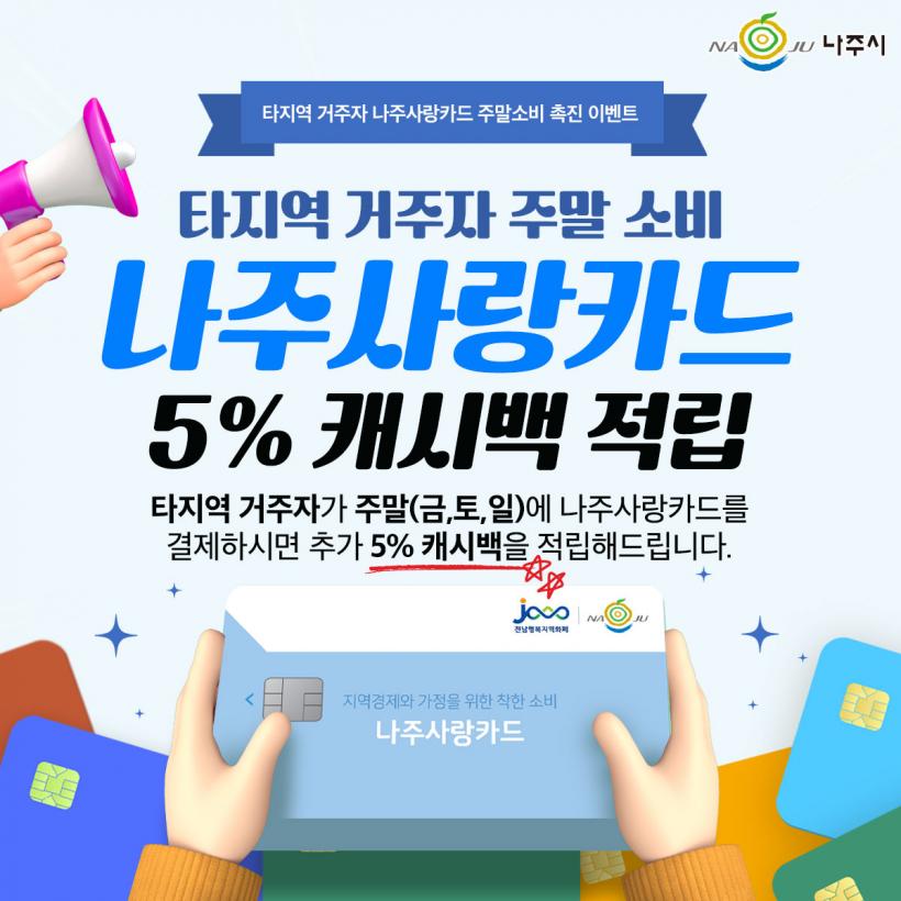 ³ªÁֽà ¿Ü ŸÁö¿ª°ÅÁÖÀÚ°¡ ±Ý¿äÀϰú ÁÖ¸» »çÀÌ ³ªÁÖ»ç¶û»óǰ±Ç °¡¸ÍÁ¡¿¡¼ ³ªÁÖ»ç¶ûÄ«µå¸¦ Ȱ¿ëÇØ ¼ÒºñÇϸé ÃѼҺñ±Ý¾×ÀÇ 5%¸¦ Çö±Ýó·³ »ç¿ëÇÒ ¼ö ÀÖ´Â ³ªÁÖ»ç¶ûÄ«µå ¾Û(Áö¿ª»óǰ±Ç chak)À¸·Î Áï½Ã Àû¸³½ÃÄÑ ÁØ´Ù.