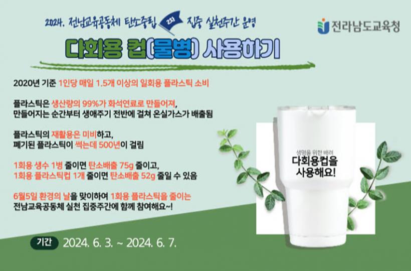 Àü³²±³À°Ã»Àº ÀÌ ±â°£ ¡®´Ùȸ¿ëÄÅ(¹°º´) »ç¿ëÇϱ⡯¸¦ ½Çõ °úÁ¦·Î Á¤ÇØ ÀÏȸ¿ë ÇÃ¶ó½ºÆ½À» ÁÙÀÌ´Â ½ÇõÀ» ÁýÁßÀûÀ¸·Î Àü°³ÇÒ °èȹÀÌ´Ù.
