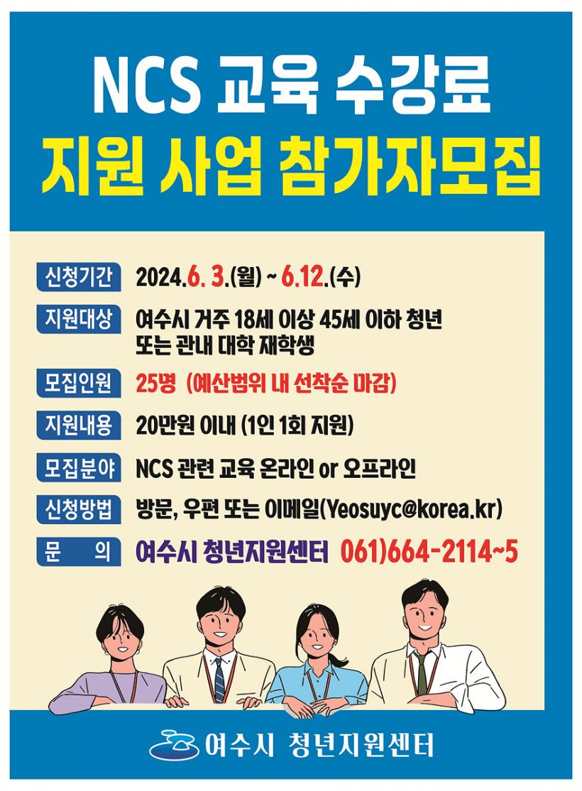 [°ø°£´º½º = ±è¿ëÁø±âÀÚ] ¿©¼ö½Ã(½ÃÀå Á¤±â¸í)°¡ NCS(±¹°¡Á÷¹«´É·ÂÇ¥ÁØ) ±³À° ¼ö°·á Áö¿ø û³â 25¸íÀ» ¼±Âø¼øÀ¸·Î ¸ðÁýÇÑ´Ù.