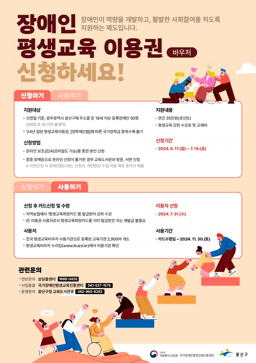[°ø°£´º½º = ±è´ë¿µ±âÀÚ] ±¤ÁÖ ±¤»ê±¸(±¸Ã»Àå ¹Úº´±Ô)´Â ¿À´Â 17ÀϺÎÅÍ Àå¾ÖÀÎÀÇ Æò»ý±³À° Âü¿© ±âȸ¸¦ È®´ëÇÏ°í Æò»ýÇнÀ ¿ª·® °³¹ßÀ» Áö¿øÇϱâ À§ÇÑ ¡®Àå¾ÖÀÎÆò»ý±³À°ÀÌ¿ë±Ç¡¯ ½ÅûÀ» ¹Þ´Â´Ù°í ¹àÇû´Ù.