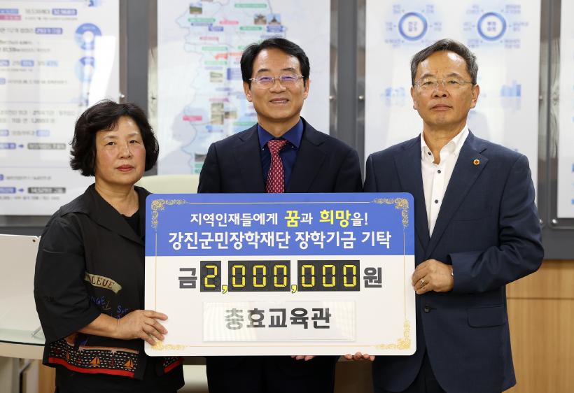 [°ø°£´º½º = Çѵ¿¼ø±âÀÚ] °Áø±º¹ÎÀåÇÐÀç´ÜÀ» ÇâÇÑ ÀåÇÐ±Ý ±âŹ Çà·ÄÀÌ À̾îÁö°í ÀÖ´Â °¡¿îµ¥ Áö³ 3ÀÏ ÃæÈ¿±³À°°ü ±èµæÈ¯ ȸÀå 2¹é¸¸¿ø, ÅðÁ÷ °ø¹«¿ø À±¿µ°ü ¾¾°¡ 3¹é¸¸ ¿ø, °Áø±º ÀÌ¿ë»çÇùȸ ¸¶Ã¢¼ö ȸÀå 1¹é¸¸¿øÀÇ ÀåÇбÝÀ» °¢°¢ °Áø±º¹ÎÀåÇÐÀç´Ü(ÀÌ»çÀå °Áø¿ø)¿¡ ±âŹÇß´Ù.