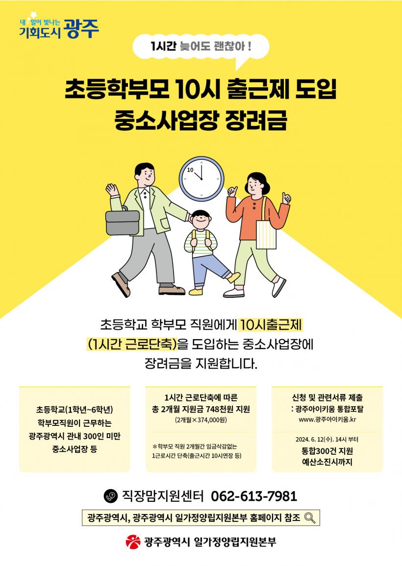 ÀÌ »ç¾÷Àº ±¤ÁÖÁö¿ª Áß¼Ò±â¾÷¿¡ ÀçÁ÷ÇÏ´Â Ãʵî Çкθð ±Ù·ÎÀÚ°¡ ÃÖ´ë 2°³¿ù °£ ÀÓ±Ý »è°¨ ¾øÀÌ ±Ù·Î½Ã°£ 1½Ã°£À» ´ÜÃàÇÒ ¼ö ÀÖ´Â Àϰ¡Á¤¾ç¸³ Áö¿ø »ç¾÷ÀÌ´Ù. ¿¹¸¦ µé¾î Ãâ±Ù½Ã°£À» ¿ÀÀü 9½Ã¿¡¼ 10½Ã·Î ´ÊÃ߰ųª, Åð±Ù½Ã°£À» ¿ÀÈÄ 6½Ã¿¡¼ 5½Ã·Î ¾Õ´ç±â´Â ¹æ½ÄÀÌ´Ù.