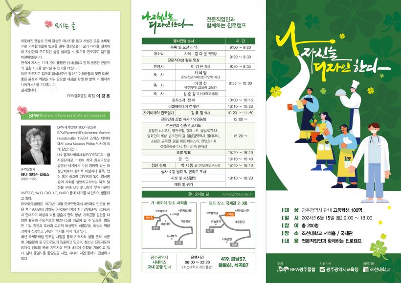 [°ø°£´º½º = ±è¼ö±Ù±âÀÚ] ±¤Áֽñ³À°Ã»ÀÌ ¿À´Â 15ÀÏ Á¶¼±´ëÇб³ ¼¼®È¦ ¹× ±¹Á¦°ü¿¡¼ BPW ±¤ÁÖŬ·´°ú ÇÔ²² °ü³» °íµîÇлý°ú Çкθ𸦠´ë»óÀ¸·Î ¡®2024 Àü¹®Á÷¾÷Àΰú ÇÔ²²ÇÏ´Â °íµîÇлý Áø·ÎÄ·ÇÁ¡¯¸¦ °³ÃÖÇÑ´Ù.