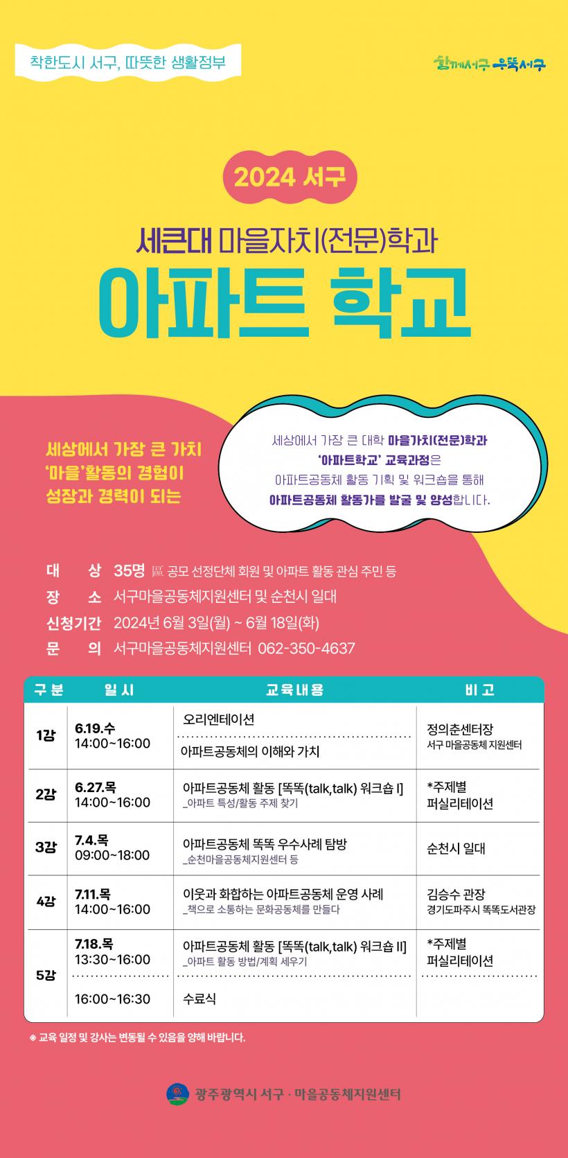 À̹ø ±³À°Àº ¼±¸ ¾ÆÆÄÆ®°øµ¿Ã¼ ȸ¿ø ¹× ÁÖ¹ÎÀ» ´ë»óÀ¸·Î âÀ۳󼺰ñÄ¿¹Â´ÏƼ¼¾ÅÍ 1Ãþ¿¡¼ ¡ã¾ÆÆÄÆ®°øµ¿Ã¼ ÀÌÇØ¿Í °¡Ä¡ È®¸³À» À§ÇÑ °ÀÇ ¡ãÀÌ¿ô°ú ÈÇÕÇÏ´Â ¾ÆÆÄÆ®°øµ¿Ã¼ ¿î¿µ»ç·Ê ¡ã¾ÆÆÄÆ®°øµ¿Ã¼ ¿ì¼ö»ç·Ê ޹æ(¼øÃµ½Ã ÀÏ´ë) ¡ã¾ÆÆÄÆ®°øµ¿Ã¼ Ȱµ¿ ±âȹÀ» À§ÇÑ ¶È¶È[talk,talk] ¿öÅ©¼ó µî ÃÑ 5°ÀÇ·Î ÁøÇàµÈ´Ù.